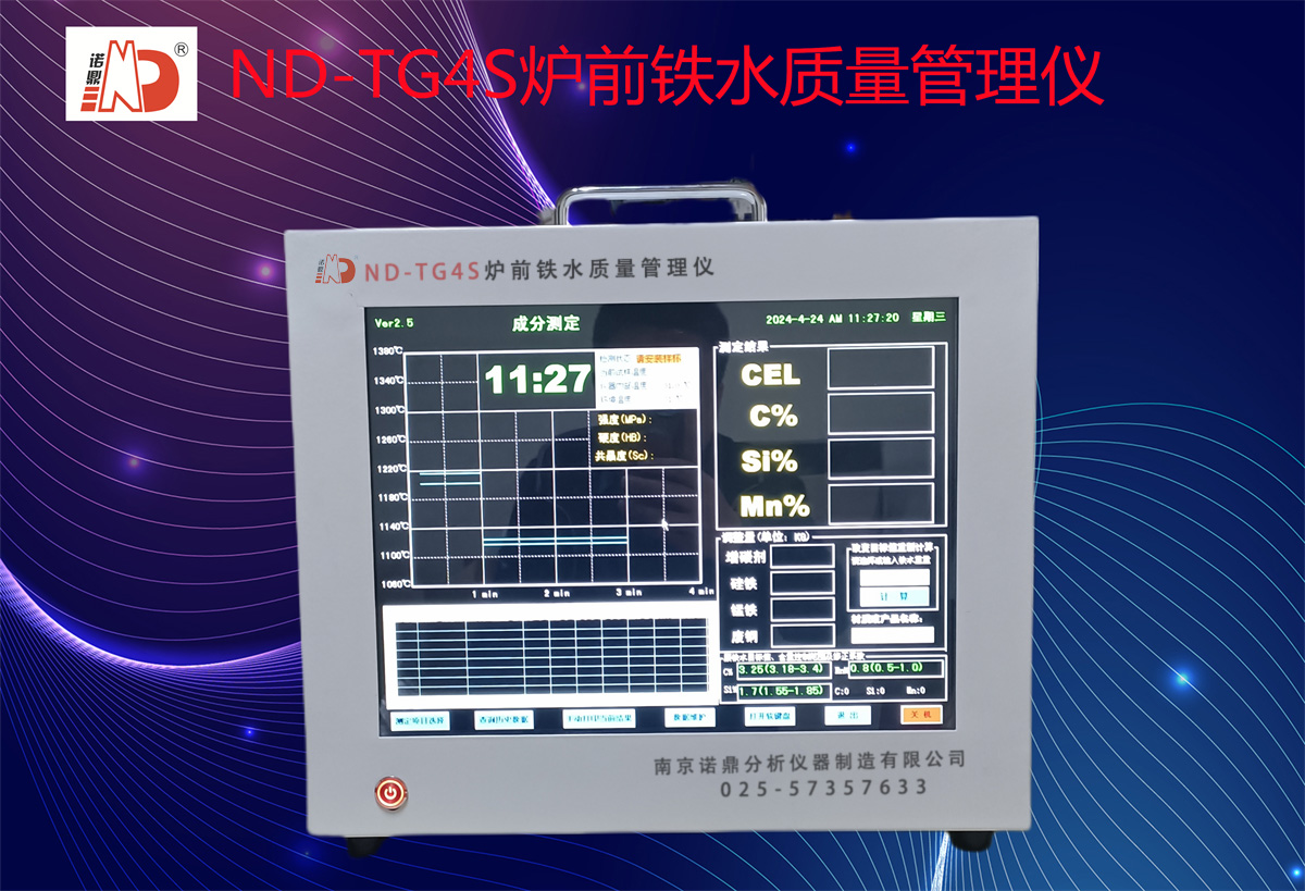 ND-TG4S爐前鐵水質(zhì)量管理儀用于爐前快速測定灰鑄鐵和球墨鑄鐵鐵水的碳當(dāng)量(CE)、碳含量(C%)、硅含量(Si%)、錳含量(Mn%);非專業(yè)人員經(jīng)簡單培訓(xùn)即可操作;設(shè)有多條檢測線(即材質(zhì)或產(chǎn)品名稱,用戶可根據(jù)本公司的實(shí)際情況任意添加),針對不同牌號的鐵水以及各廠的實(shí)際情況選擇恰當(dāng)?shù)臋z測線,可使檢測結(jié)果更準(zhǔn)確。主要功能如下: